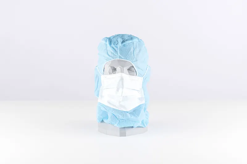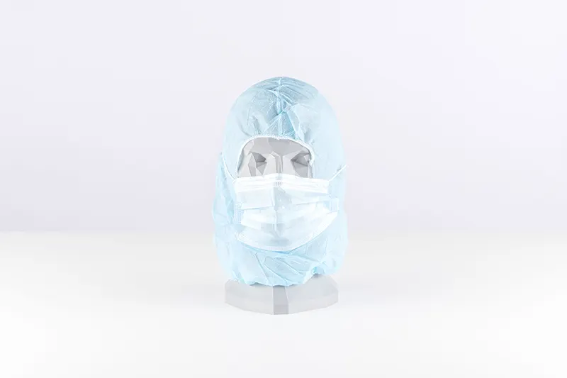 Gorro desechable o capucha tipo astronauta, con mascarilla quirúrgica Tipo IIR de 3 capas, cosida al gorro, con sujeción mediante 1 goma (exenta de látex) a la cabeza. Capucha fabricada en tejido no tejidode Polipropileno (PP), con elásticos en la parte inferior (para el cuello) y en la parte superior (frente) para un mejor ajuste. Disponible en color blanco, azul o amarillo.