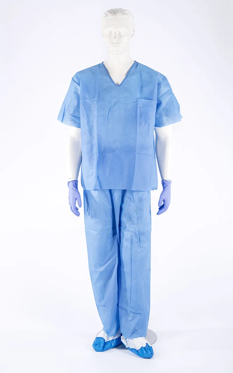 Conjunto de dos piezas compuesto por casaca y pantalón desechable, fabricado tejido no tejido de SMS de color azul cielo. Material hidrófugo y transpirable, exento de látex.