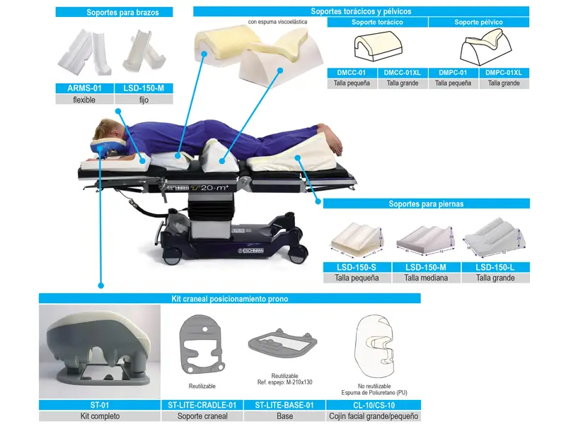 Sus diferentes componentes ayudan a conseguir una línea cervical neutra y además están exentos de látex. Además, combinando diferentes accesorios para las distintas partes del cuerpo, se consigue adaptar cualquier camilla a las distintas morfologías de los pacientes.